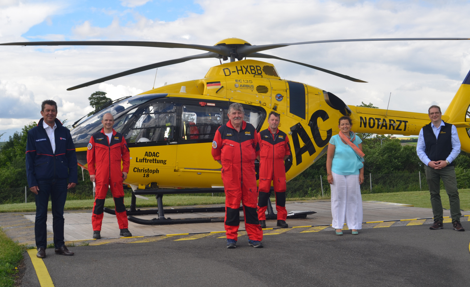 ADAC Luftrettung Crew mit gelbem Rettungshubschrauber Christoph 18, fünf Personen stehen vor dem Helikopter