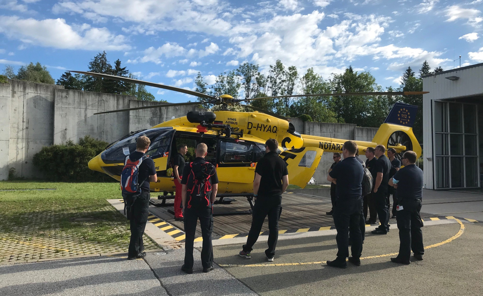 Ein Teil des theoretischen Unterrichts hat am 1. Juli 2020 auf der ADAC Luftrettungsstation bei „Christoph Murnau“ stattgefunden. Zehn Teilnehmer aus ganz Bayern, unter der Leitung von Fachbereichsleiter Markus Harrer, wurden von ADAC Luftrettungsmitarbeiter Gerhard Opperer herzlich in Murnau empfangen. Bei schönstem Wetter wurde zu Beginn der Hubschrauber der ADAC Luftrettung „Christoph Murnau“ besichtigt. Es wurden die Besonderheit des Hubschraubers vom Modell H 145 erklärt. Der leistungsstarke Intensivhubschrauber verfügt über eine Winde, um in schwer zugänglichem Gelände Menschen in Not medizinisch zu versorgen und in das geeignete Krankenhaus zu fliegen. Im Alpenraum werden häufig Wanderer, Mountainbiker oder Kletterer mit der Winde in den Bergen gerettet.
